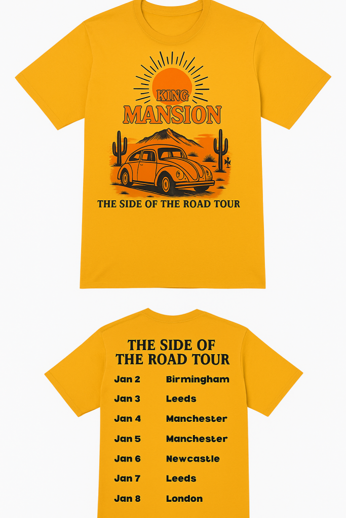 Merch Merch Get all your King Mansion merch here. The Side of the road tour t-shirt Exclusive ‘The Side of the Road Tour T-Shirt’ available now!Sizes available: S, M, L, XL, XXL Only £20 (delivery included) emailkingmansionband@gmail.comto order!